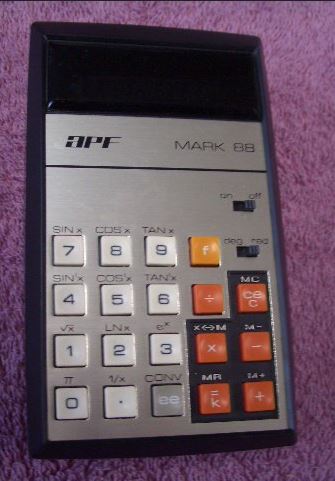 The APF MARK 88 is a scientific calculator with unknown digits precision and algebraic logic. It has an unknown number of functions, 19 keys and a VFD (vacuum fluorescent) display. The power source is 3xAAA batteries.