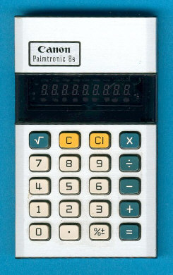 This is a calculator with a slim and metallic design that was to be common right up to the mid 1980s. The blue and silver theme works well. The original case is a wallet style cover with the calculator sitting on the left held by a PVC band and tray. It is made from black (outside) and silver (inside) soft plastic with “Canon Palmtronic” silver printed on the front and back. The logic is OK with good recovery but is let down by negative square roots. Interesting to see (below) that this uses the same IC as the LD-8Rs but the square root function switched on and the memory switched off.