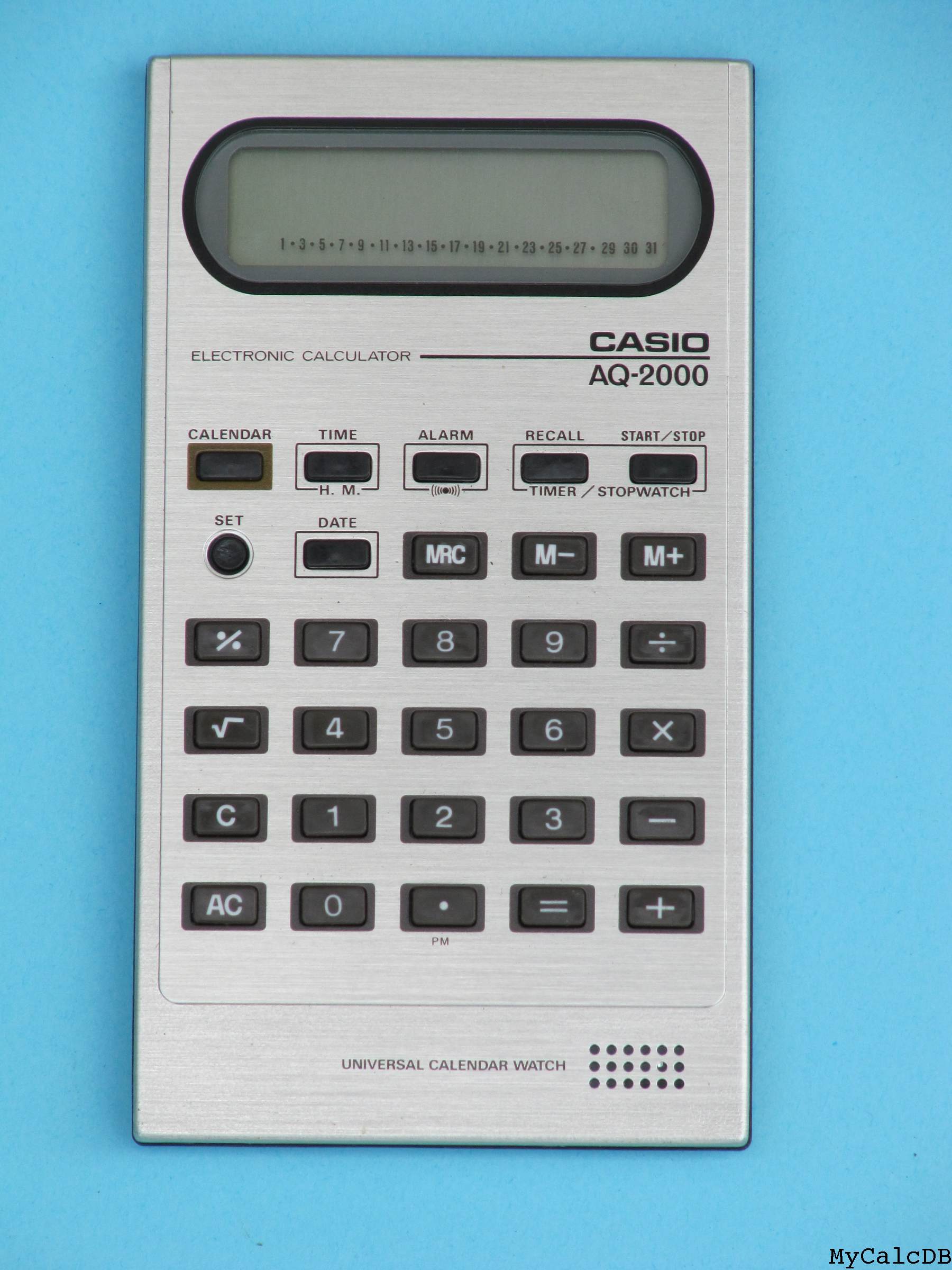 The Casio AQ-2000 is an arithmetic calculator with 8 digits precision and algebraic logic. It has 6 functions, 30 keys and an LCD (liquid crystal) display. The power source is 2x1.5V cell.