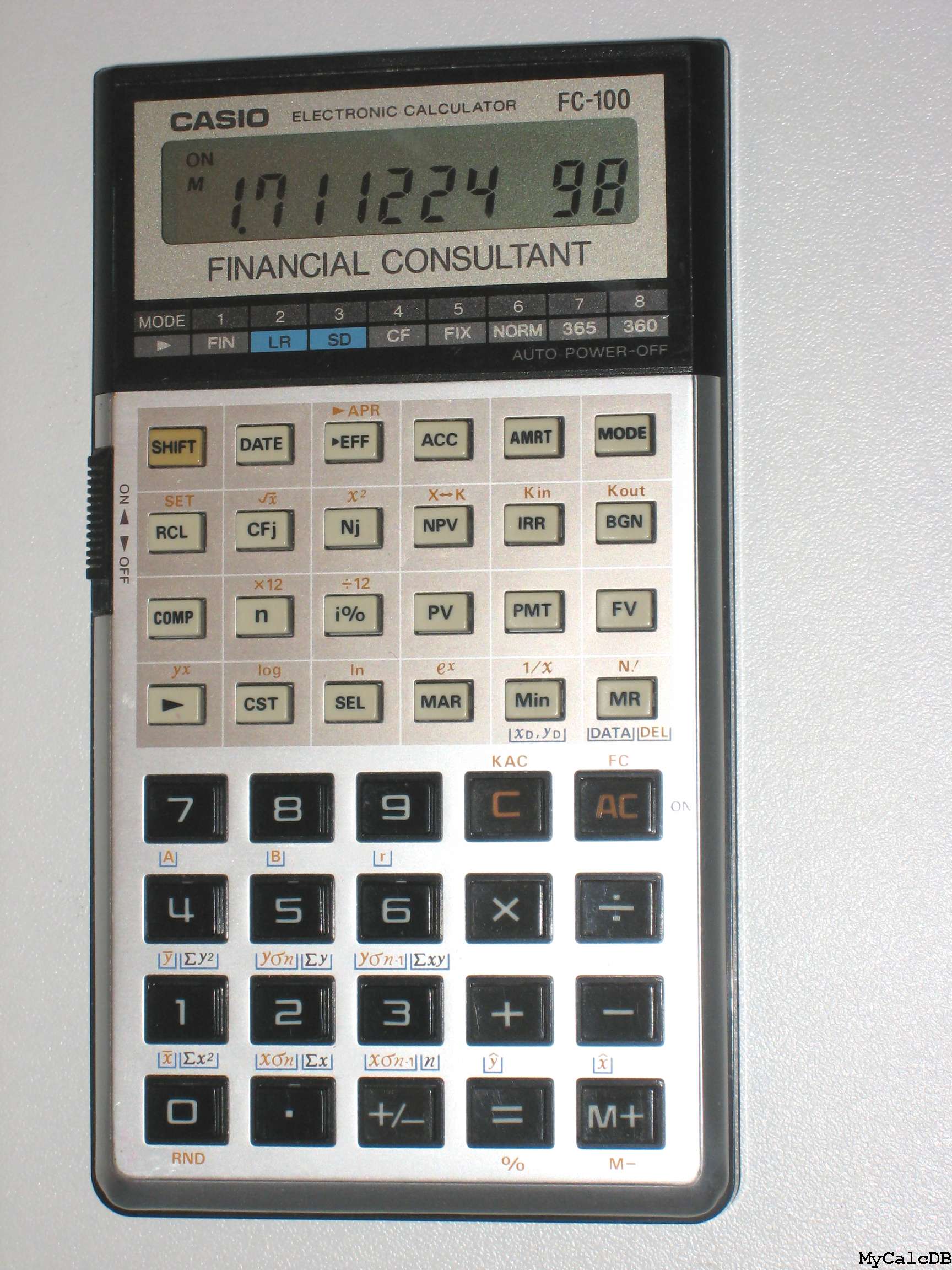 The Casio FC-100 FINANCIAL CONSULTANT is a finance calculator with 10 digits precision and algebraic logic. It has an unknown number of functions, 44 keys and an LCD (liquid crystal) display. The power source is CR2025 3V. The calculator was manufactured in Japan; Malaysia.