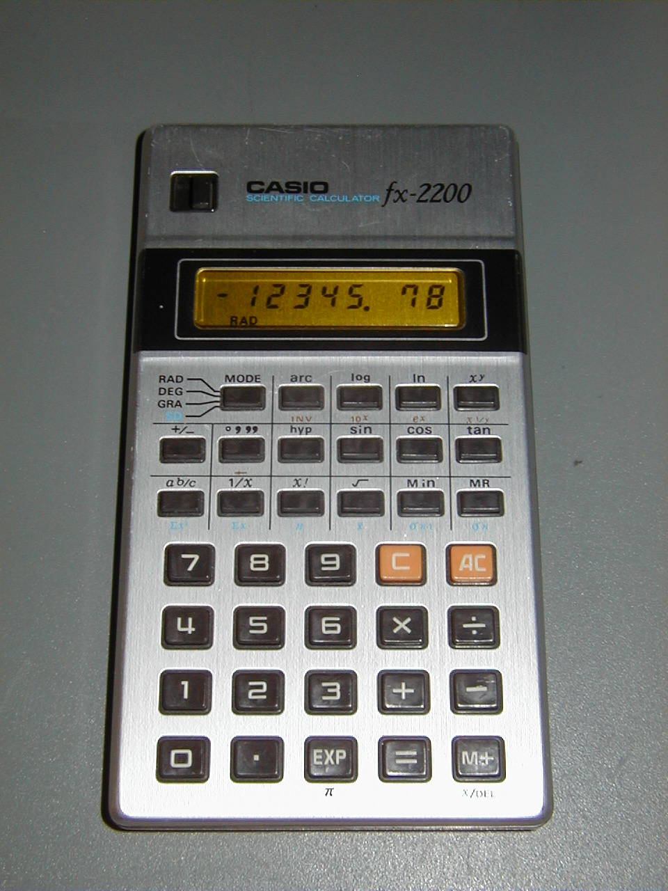 The Casio fx-2200 is a scientific calculator with 8 digits precision and algebraic logic. It has 31 functions, 37 keys and one of the early LCD (liquid crystal) displays which incorporated a yellow filter. The power source is 3xLR44. The calculator was manufactured in Japan.