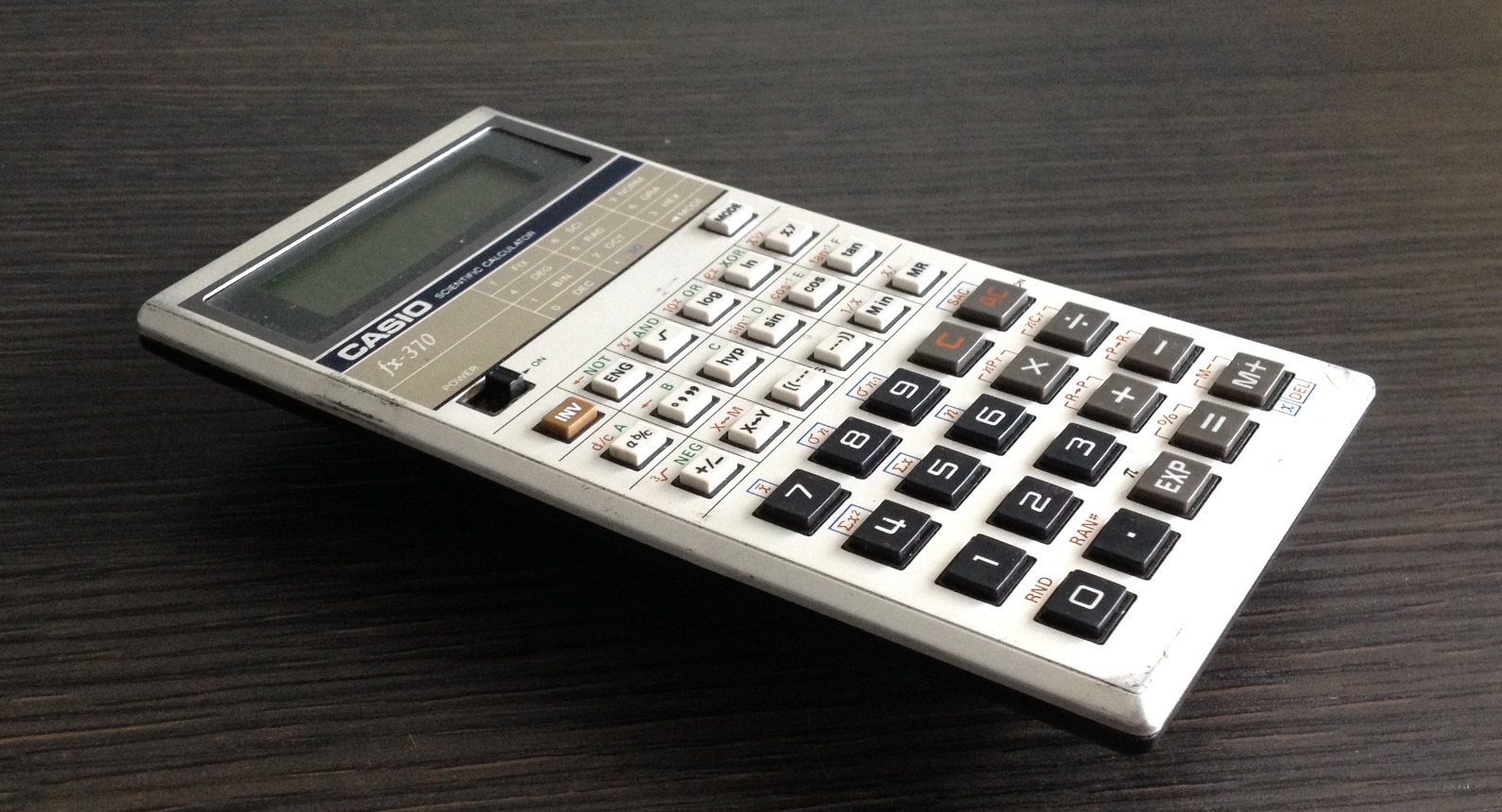 The Casio fx-370 is a scientific calculator with 8 digits precision and algebraic logic. It has 60 functions, 39 keys and an LCD (liquid crystal) display. The power source is 2xAA batteries. The calculator was manufactured in Japan.