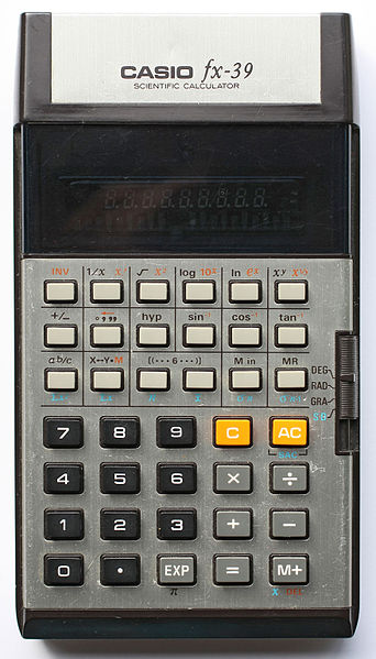 The Casio fx-39 is a scientific calculator with 8 digits precision and algebraic logic. It has 44 functions, 38 keys and a VFD (vacuum fluorescent) display. The power source is 2xAA batteries. The calculator was manufactured in Japan.