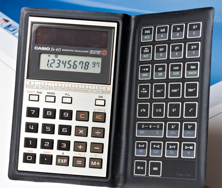 The Casio fx-411 is a scientific calculator with 10 digits precision and algebraic logic. It has an unknown number of functions, 53 keys and an LCD (liquid crystal) display. The power source is Solar. The calculator was manufactured in Japan.