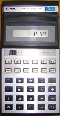 The Casio fx-5 is an arithmetic calculator with 8 digits precision and algebraic logic. It has 14 functions, 32 keys and an LCD (liquid crystal) display. The power source is 2xAA batteries.