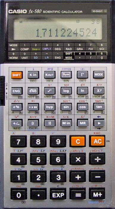 The Casio fx-580 is a scientific calculator with 12 digits precision and algebraic logic. It has 60 functions, 44 keys and an LCD (liquid crystal) display. The power source is CR2025 3V. The calculator was manufactured in Japan.