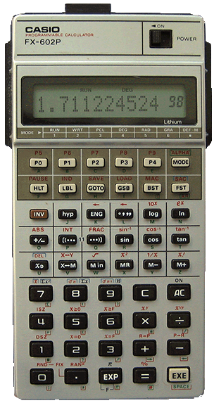 The Casio fx-602P is a programmable calculator with 10 digits precision and algebraic logic. It has an unknown number of functions, 50 keys and an LCD (liquid crystal) display. The power source is 2x3V cell. The calculator was manufactured in Japan.