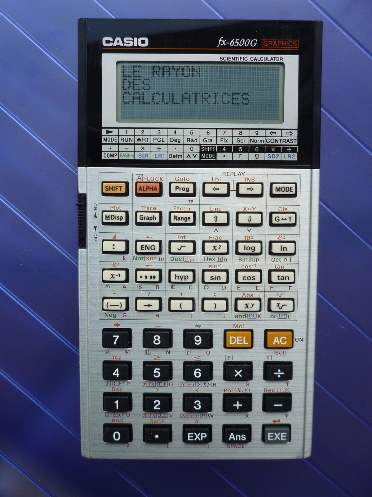 The Casio fx-6500G is a graphing calculator with 10 digits precision and formula input logic. It has an unknown number of functions, 50 keys and an LCD (liquid crystal) display. The power source is 3x1.5V cell.