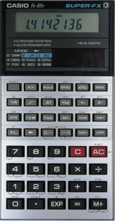 The Casio fx-85V SUPER-FX is a scientific calculator with 8 digits precision and algebraic logic. It has an unknown number of functions, 44 keys and an LCD (liquid crystal) display. The power source is Solar. The calculator was manufactured in Japan.