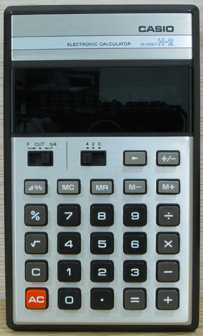 The Casio H-2 is an arithmetic calculator with 10 digits precision and algebraic logic. It has 9 functions, 27 keys and a VFD (vacuum fluorescent) display. The power source is 2xAA batteries. The calculator was manufactured in Japan.