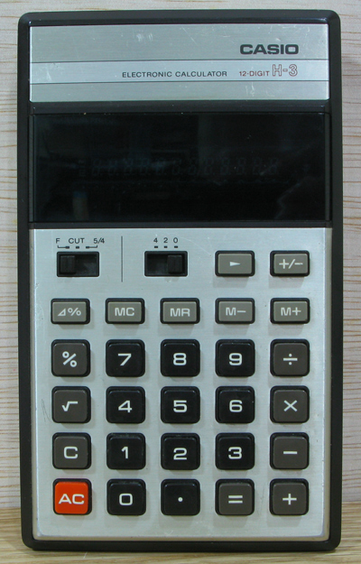 The Casio H-3 is an arithmetic calculator with 12 digits precision and algebraic logic. It has 9 functions, 27 keys and a VFD (vacuum fluorescent) display. The power source is 2xAA batteries. The calculator was manufactured in Japan.