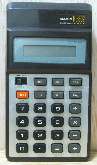 The Casio HL-802B HL-802B is an arithmetic calculator with 8 digits precision and algebraic logic. It has 6 functions, 23 keys and an LCD (liquid crystal) display. The power source is 2xAA batteries. The calculator was manufactured in Japan.