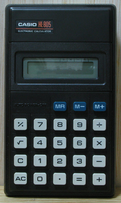 The Casio HL-805 is an arithmetic calculator with 8 digits precision and algebraic logic. It has 6 functions, 23 keys and an LCD (liquid crystal) display. The power source is 2xAA batteries. The calculator was manufactured in Japan.