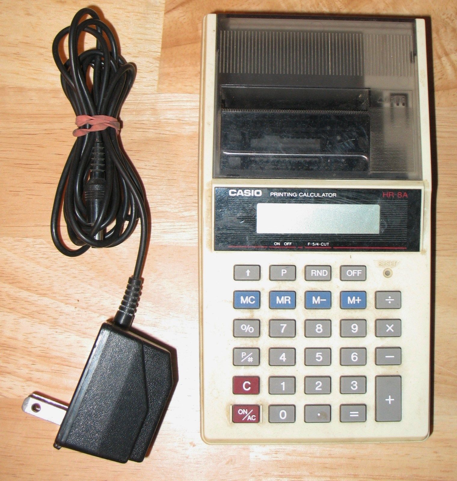 The Casio HR-8A is an arithmetic calculator with unknown digits precision and algebraic logic. It has 6 functions, 29 keys and an LCD (liquid crystal) display.