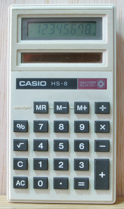 The Casio HS-8 is an arithmetic calculator with 8 digits precision and algebraic logic. It has 6 functions, 23 keys and an LCD (liquid crystal) display. The power source is Solar. The calculator was manufactured in Japan.