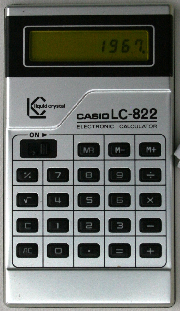 The Casio LC-822 is an arithmetic calculator with 8 digits precision and algebraic logic. It has 6 functions, 23 keys and one of the early LCD (liquid crystal) displays which incorporated a yellow filter. The power source is 2x1.5V cell.