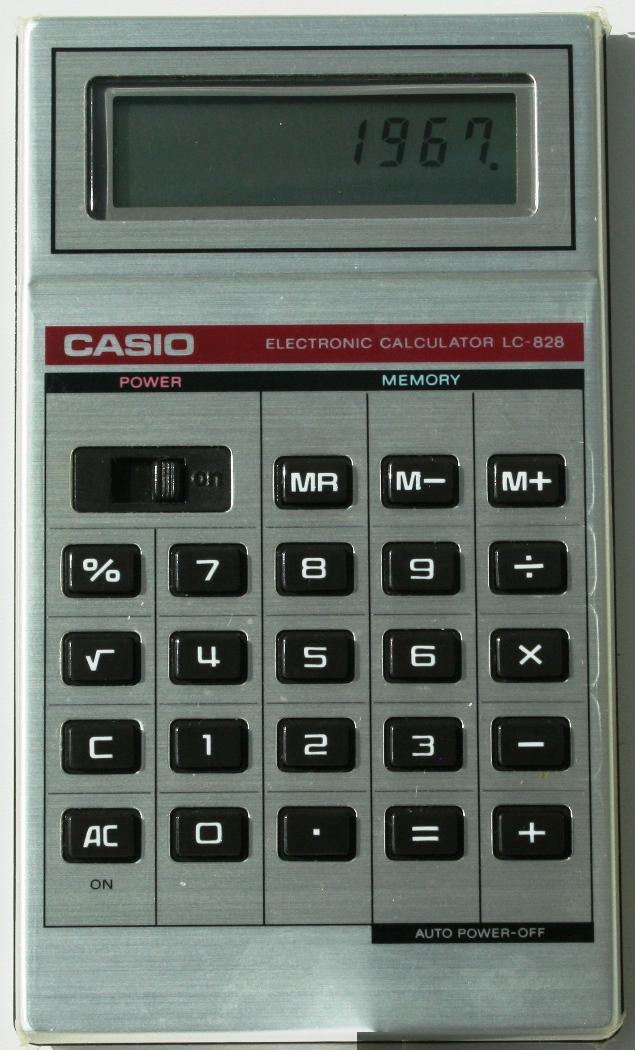 The Casio LC-828 is an arithmetic calculator with 8 digits precision and algebraic logic. It has 6 functions, 23 keys and an LCD (liquid crystal) display. The power source is 2x1.5V mercury cell. The calculator was manufactured in Japan.