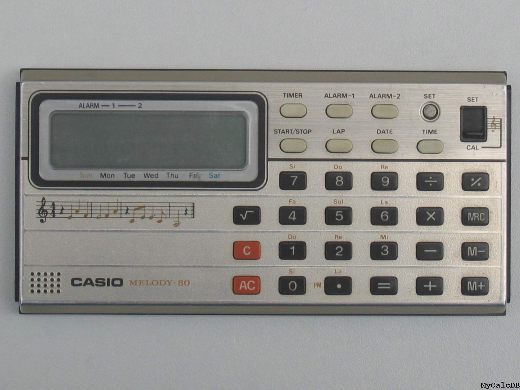 The Casio MELODY-80 is an arithmetic calculator with 8 digits precision and algebraic logic. It has 6 functions, 31 keys and an LCD (liquid crystal) display. The power source is 2x1.5V cell. The calculator was manufactured in Japan.