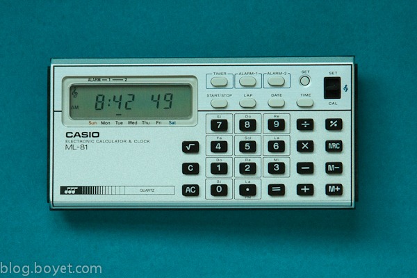 The Casio ML-81 is an arithmetic calculator with 8 digits precision and algebraic logic. It has 6 functions, 31 keys and an LCD (liquid crystal) display. The power source is 2x1.5V cell. The calculator was manufactured in Japan.
