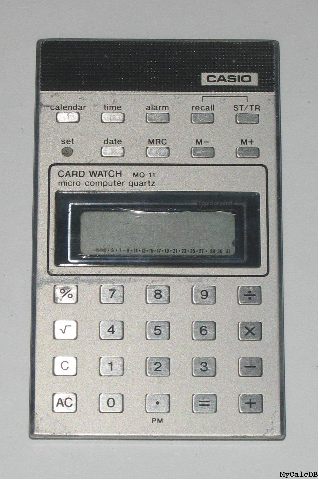 The Casio MQ-11 CARD WATCH ; MQ-11B is an arithmetic calculator with 8 digits precision and algebraic logic. It has 6 functions, 30 keys and an LCD (liquid crystal) display. The power source is 2x1.5V cell. The calculator was manufactured in Japan.