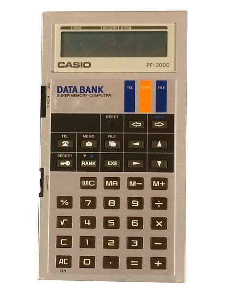 This is Casio's very first Digital Diary, introduced in May 1983.This organiser has a phone memory for phone numbers and names. It also has a memo function for general notes. There's also a basic function calculator and a spread-sheet like ability.