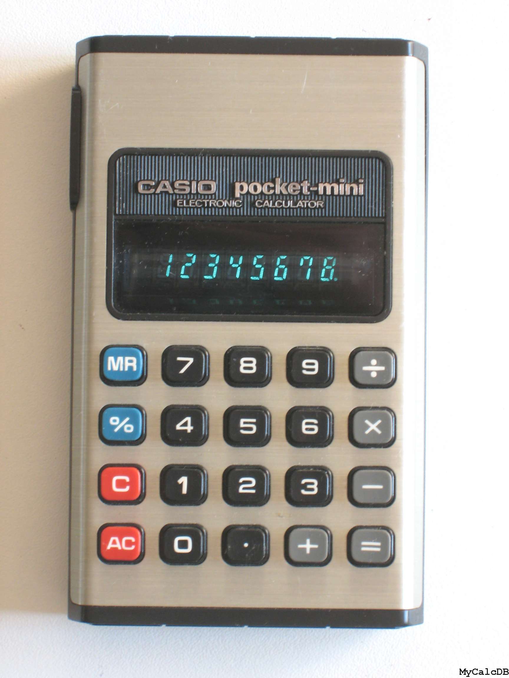 The Casio pocket-mini P-810 P-810 is an arithmetic calculator with 8 digits precision and algebraic logic. It has 5 functions, 20 keys and a VFD (vacuum fluorescent) display. The power source is 2xAA batteries. The calculator was manufactured in Japan.