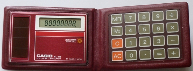 The Casio SL-8 is an arithmetic calculator with 8 digits precision and algebraic logic. It has an unknown number of functions, 20 keys and an LCD (liquid crystal) display. The calculator was manufactured in Japan.