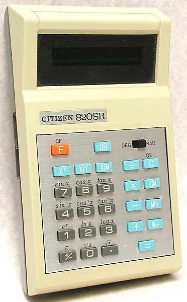 The Citizen 820SR is a scientific calculator with unknown digits precision and algebraic logic. It has 20 functions, 26 keys and a VFD (vacuum fluorescent) display.