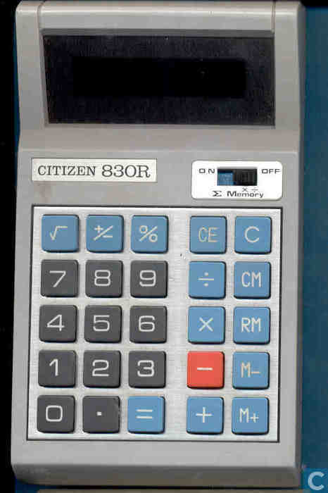 The Citizen 830R is an arithmetic calculator with 8 digits precision and algebraic logic. It has 7 functions, 25 keys and a VFD (vacuum fluorescent) display. The power source is 4xAA batteries.