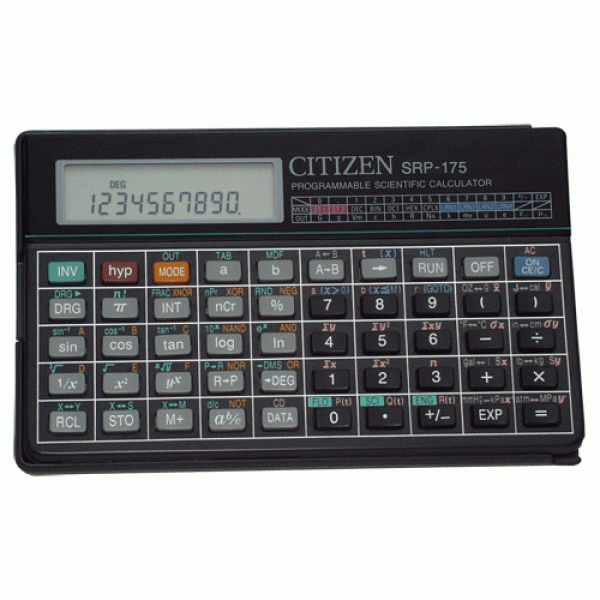 The Citizen SRP-175 is a programmable calculator with 10 digits precision and algebraic logic. It has an unknown number of functions, unknown keys and an LCD (liquid crystal) display.