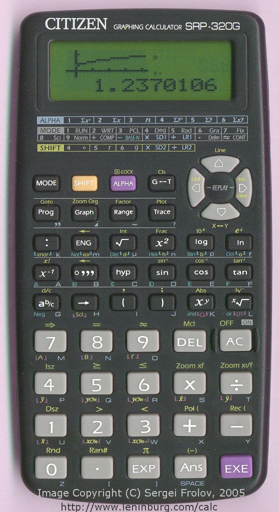 The Citizen SRP-320G is a graphing calculator with unknown digits precision and formula input logic. It has an unknown number of functions, unknown keys and an LCD (liquid crystal) display.
