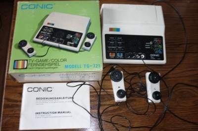 Conic TV Sports TG 721. This system is quite interesting although it looks like the very common TG-621 system, but if you have a closer look you can see that it provides only 3 games than the typical 4 games and the controllers had a second for horizontal motion. Not much is known about this system but it surfaced only 2 or 3 times so far. It is surely one of the rarest Conic consoles. This was also sold by Poppy as the model TVG-3.