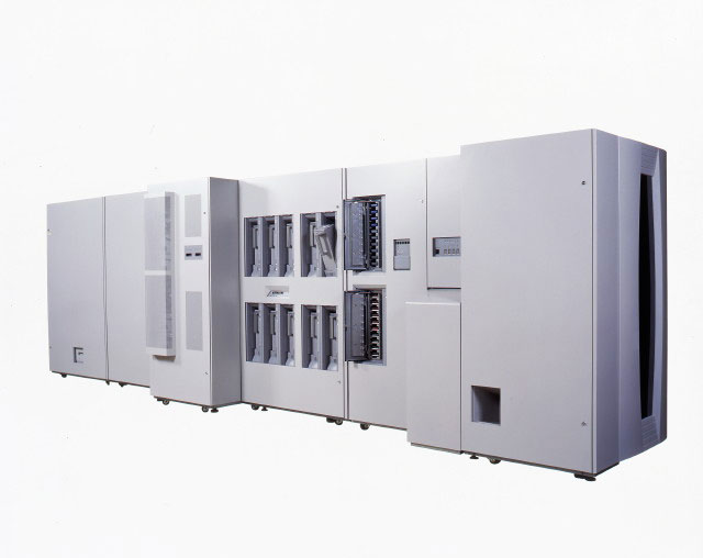 The F6458, which began shipping in July 1998, was Fujitsu’s mid-range tape library that used IBM 3480/3490-format tape media. Fujitsu had already released the F6455 tape library (which started shipping in April 1989) and the F6457 tape library (which started shipping in July 1995) that worked with IBM 3480-format tape media. The F6458, as the F6455’s successor, was developed to make use of compact tape drives to store cartridges more efficiently and, thus, address the demand for higher installation efficiencies.