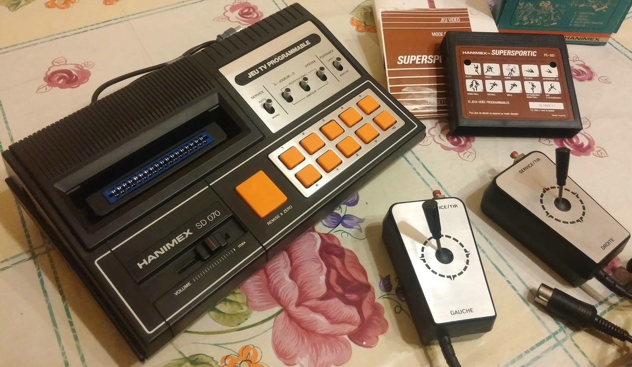 Hanimex SD-070 Colour is a cartridge console made by Hanimex in 1982. The system has two detachable controllers with one analog joystick and one fire button each. The control panel is composed of 10 buttons to select the different games offered by each cartridge (10 being the maximum). Difficulty switches, power switch, service auto/manual switch and a start button can also be found.