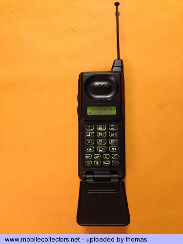 The BT Diamond II was released in 1994 and is in fact a rebranded Motorola phone. It is of a flip phone design and is shown here located within its charging cradle. In addition to the normal phone functions it provided automatic redial, a recent number memory that stored the last 10 dialled numbers, an address book that could store up to 99 telephone numbers and associated names, audible call timers and access to network features such as the answer phone and call back services.