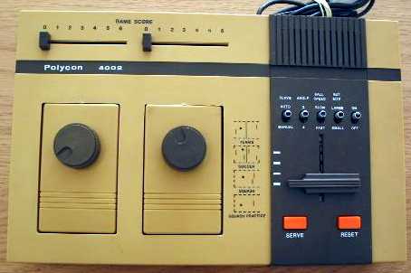 Polycon 4002 (C-4002) is a pong console released in 1977. C4002 is a dedicated console playing four Pong variants. The console uses the AY-3-8500 dedicated pong chip and features only the paddle and ball games. The games are Tennis, Soccer, Squash and Practice. Settings allow for automatic serve, paddle size, ball speed and deflection angle. The console uses sliders to keep score between individual matches and paddles to control the ball.