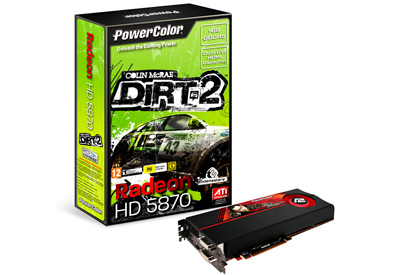 PowerColor AX5870 1GBD5-MDHG Radeon HD5870 1GB GDDR5 DIRT2 Edition PCI Express 2.0 x16 Video Card. Supports OpenGL 3.2 and DirectX 11. Crossfire Ready. With HDMI, DisplayPort and two DVI ports.