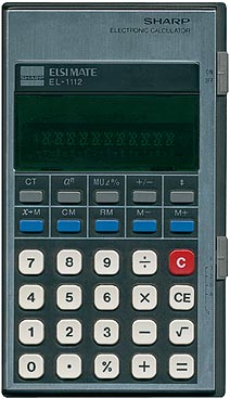 The Sharp EL-1112 ELSIMATE is an arithmetic calculator with 10 digits precision and algebraic logic. It has 11 functions, 30 keys and a VFD (vacuum fluorescent) display. The power source is 2xAA batteries.