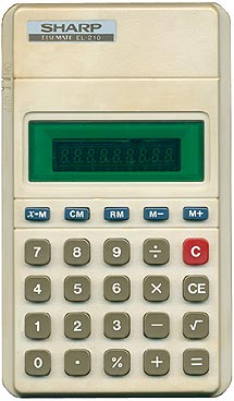 The Sharp EL-210 ELSIMATE is an arithmetic calculator with 8 digits precision and algebraic logic. It has 6 functions, 25 keys and a VFD (vacuum fluorescent) display. The power source is 2xAA batteries.