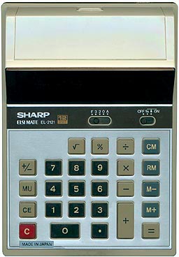 The Sharp EL-2121 ELSIMATE is an arithmetic calculator with 12 digits precision and algebraic logic. It has 8 functions, 26 keys and a VFD (vacuum fluorescent) display. The power source is 4xAA batteries.