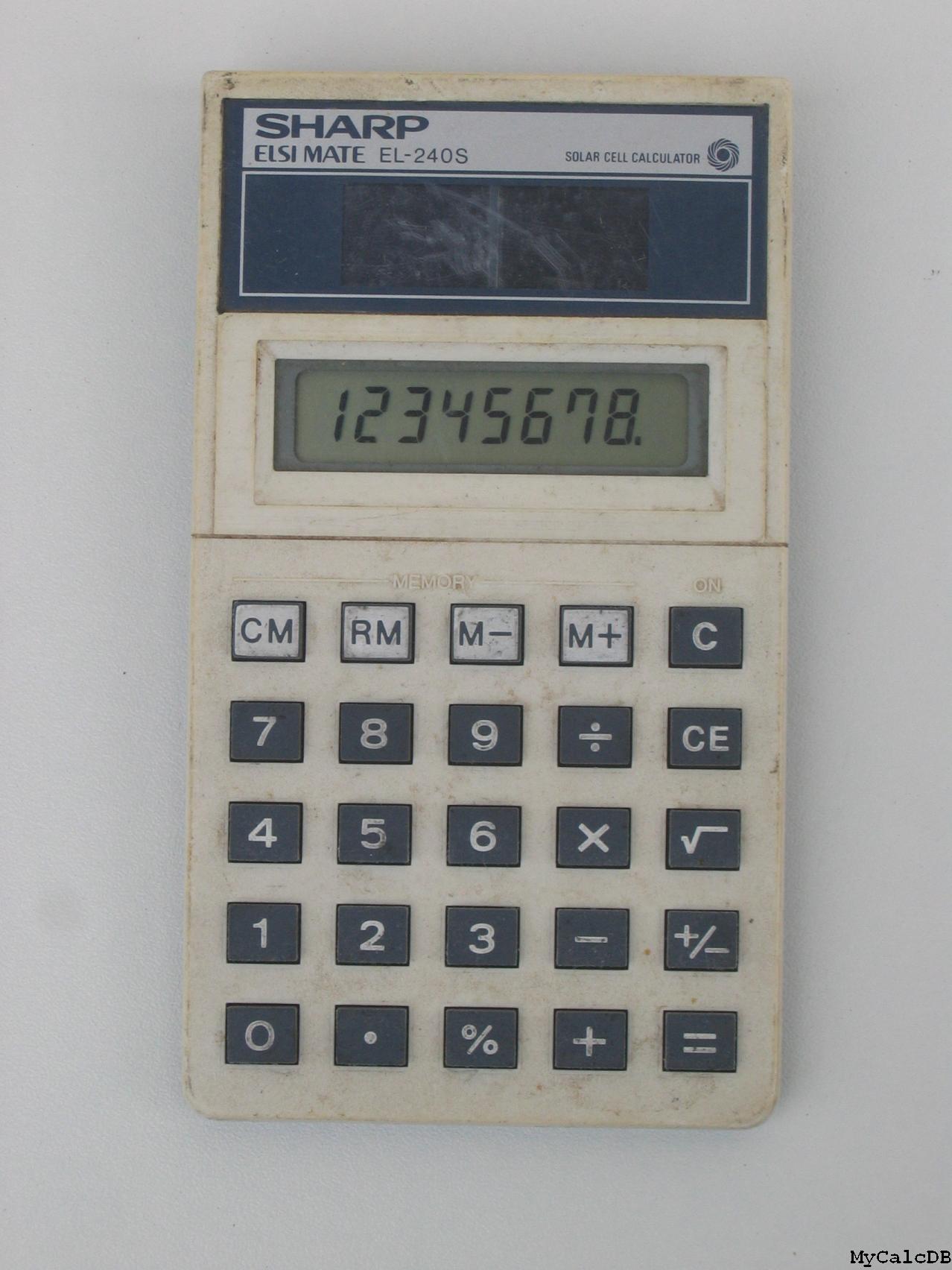 The Sharp EL-240S ELSIMATE is an arithmetic calculator with 8 digits precision and algebraic logic. It has 7 functions, 25 keys and an LCD (liquid crystal) display. The power source is Solar.
