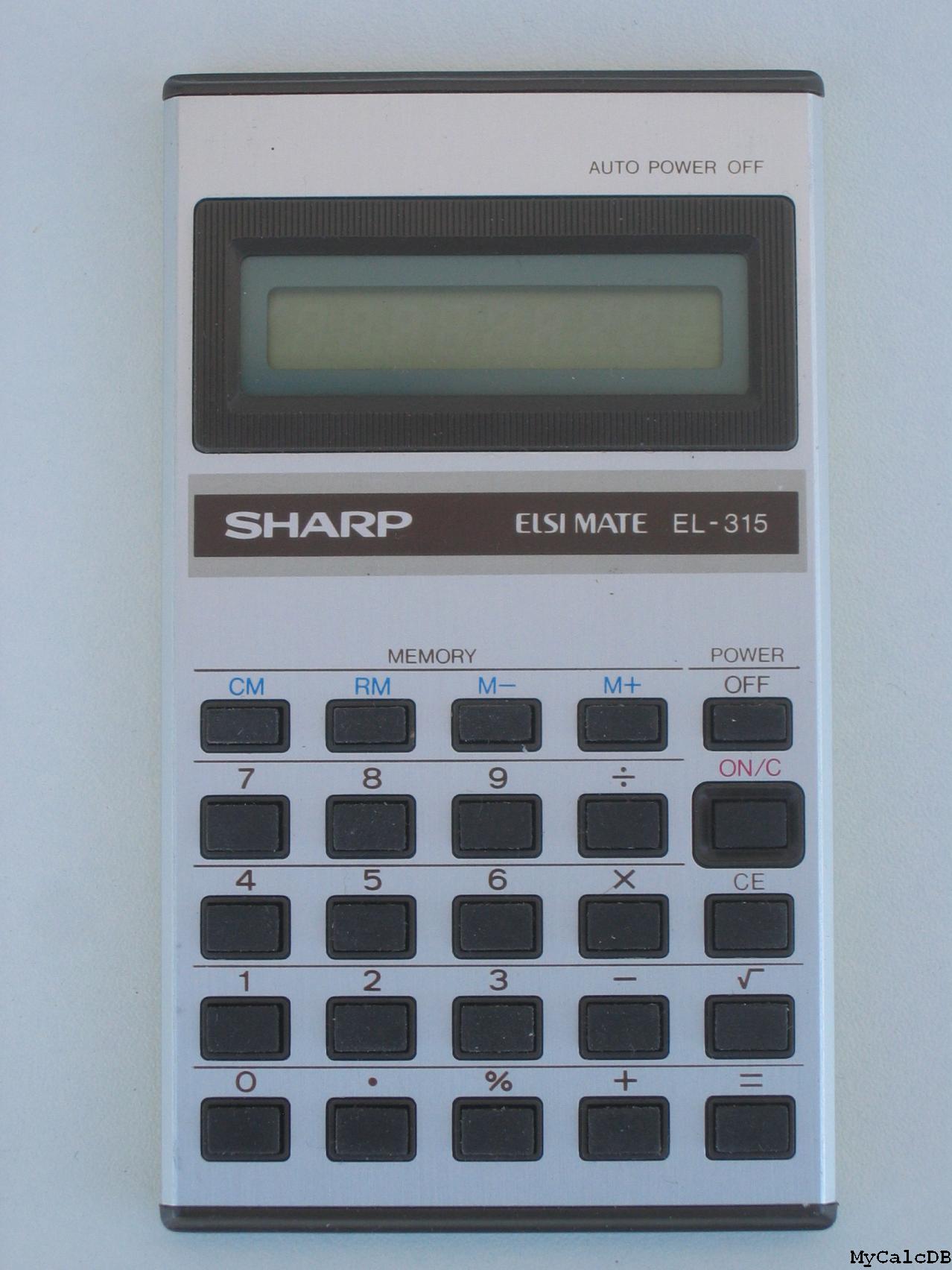 The Sharp EL-315 ELSIMATE is an arithmetic calculator with 8 digits precision and algebraic logic. It has 6 functions, 25 keys and an LCD (liquid crystal) display. The power source is 2xLR43.