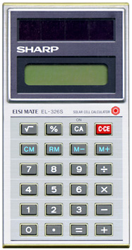 The Sharp EL-326S ELSIMATE is an arithmetic calculator with 8 digits precision and algebraic logic. It has 7 functions, 24 keys and an LCD (liquid crystal) display. The power source is Solar.