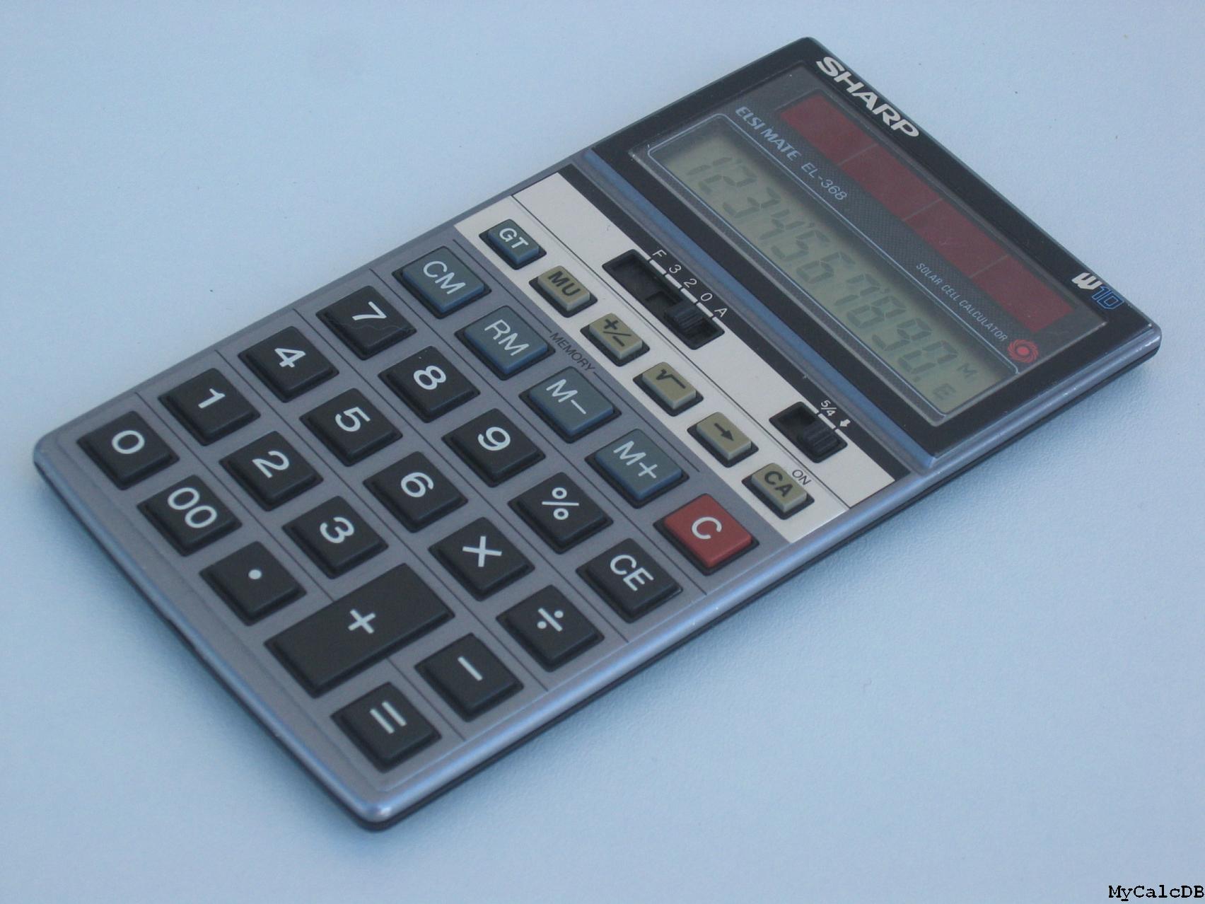 The Sharp EL-368 ELSIMATE is an arithmetic calculator with 10 digits precision and algebraic logic. It has 6 functions, 30 keys and an LCD (liquid crystal) display. The power source is Solar.
