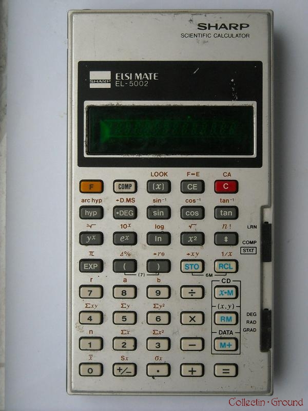 The Sharp EL-5002 ELSIMATE is a scientific calculator with 10 digits precision and algebraic logic. It has an unknown number of functions, 40 keys and a VFD (vacuum fluorescent) display. The power source is 2xAA batteries.