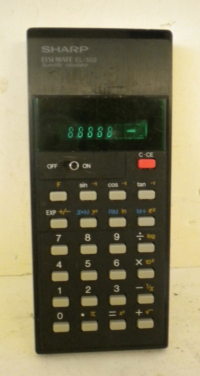 The Sharp EL-502 ELSIMATE is a scientific calculator with 8 digits precision and algebraic logic. It has 21 functions, 25 keys and a VFD (vacuum fluorescent) display. The power source is PP3 9V. The calculator was manufactured in Japan.
