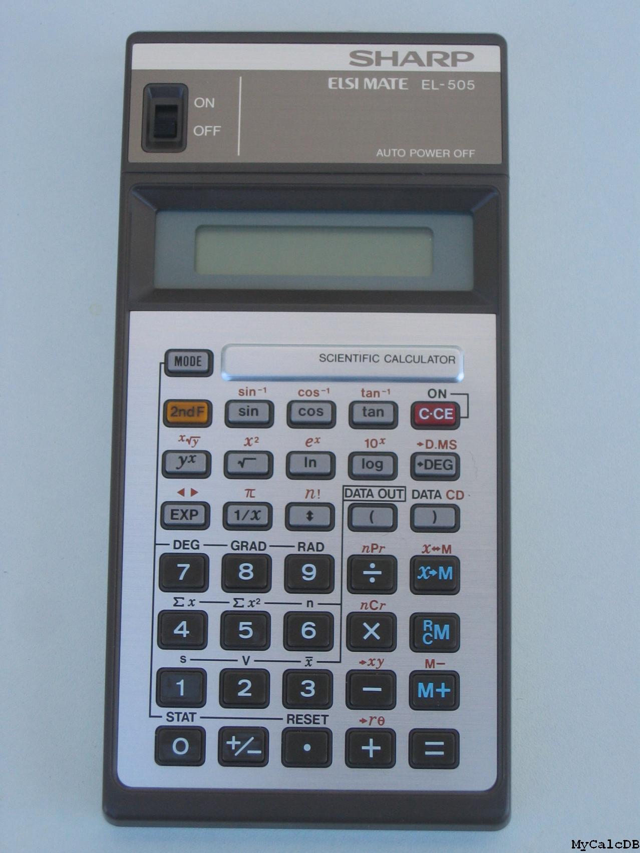 The Sharp EL-505 ELSIMATE is a scientific calculator with 8 digits precision and algebraic logic. It has an unknown number of functions, 36 keys and an LCD (liquid crystal) display. The power source is 2xAA batteries.