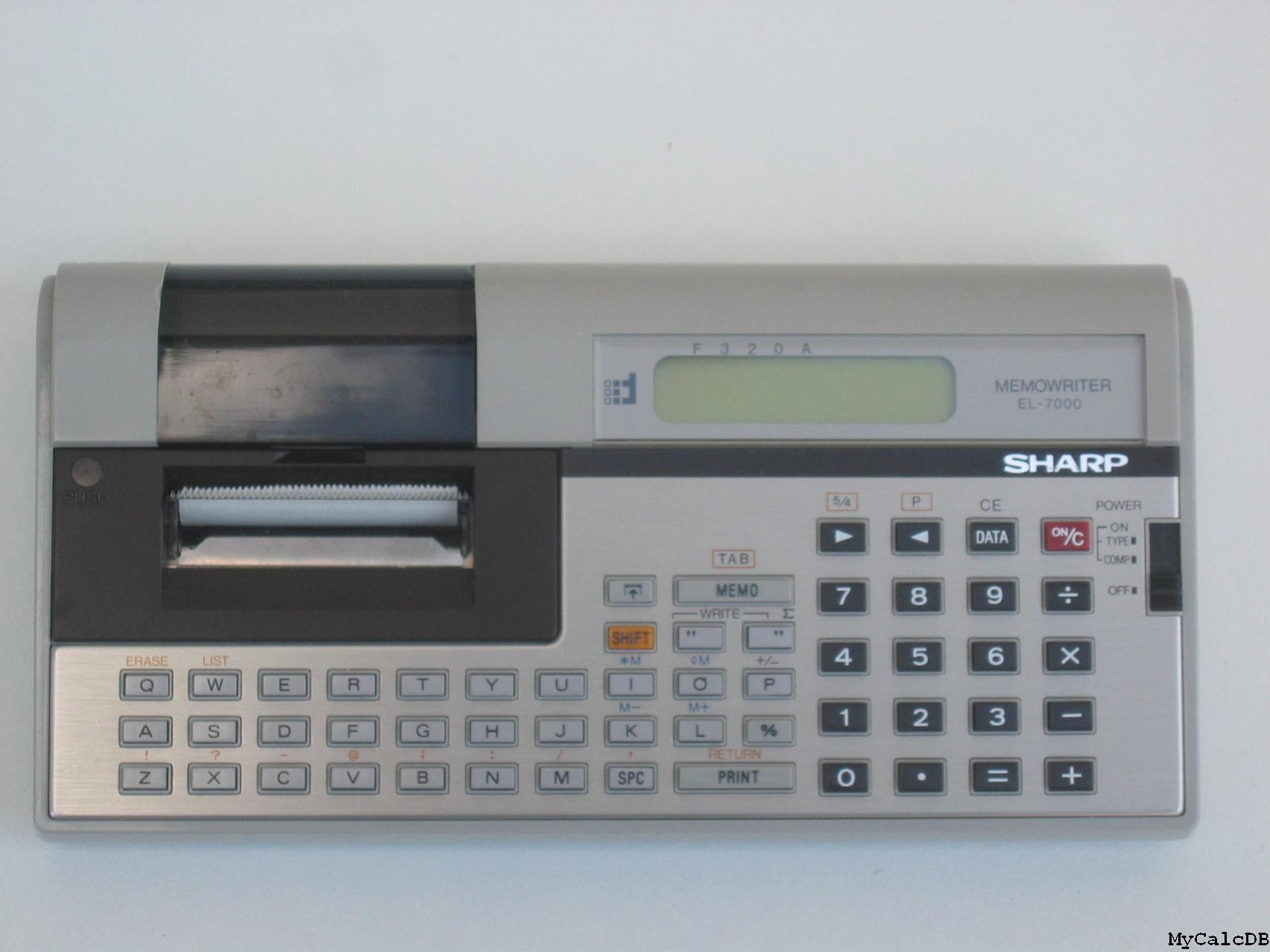 The Sharp EL-7000 MEMOWRITER is an arithmetic calculator with 10 digits precision and algebraic logic. It has 6 functions, 54 keys and an LCD (liquid crystal) display. The power source is 4xAA batteries.