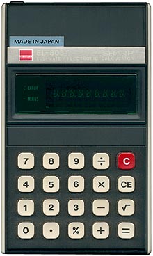 The Sharp EL-8031 ELSIMATE is an arithmetic calculator with 8 digits precision and algebraic logic. It has 6 functions, 20 keys and a VFD (vacuum fluorescent) display. The power source is 2xAA batteries. The calculator was manufactured in Japan.