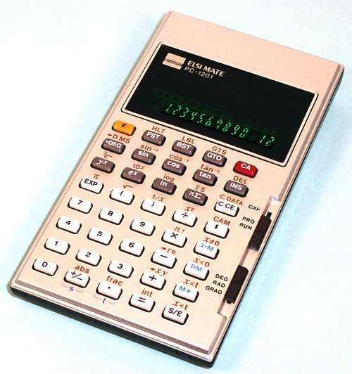 The Sharp PC-1201 POCKET COMPUTER is a programmable calculator with 10 digits precision and algebraic logic. It has 52 functions, 40 keys and a VFD (vacuum fluorescent) display. The power source is 2xAA + 2x1.5V mercury cell.